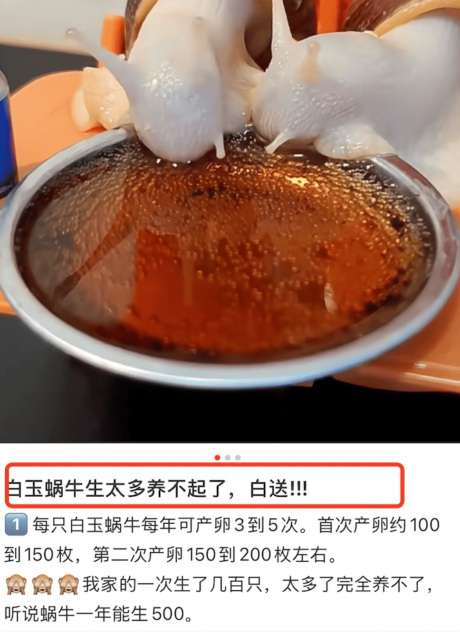白玉蜗牛繁殖能力超强,每次繁殖超过一百枚蛋,后来她给周边邻居免费送都没人要。