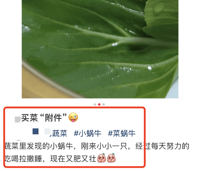 随着平台应季蔬菜的供应越来越丰富,很多消费者表示自己买菜时发现菜里附带着蜗牛。