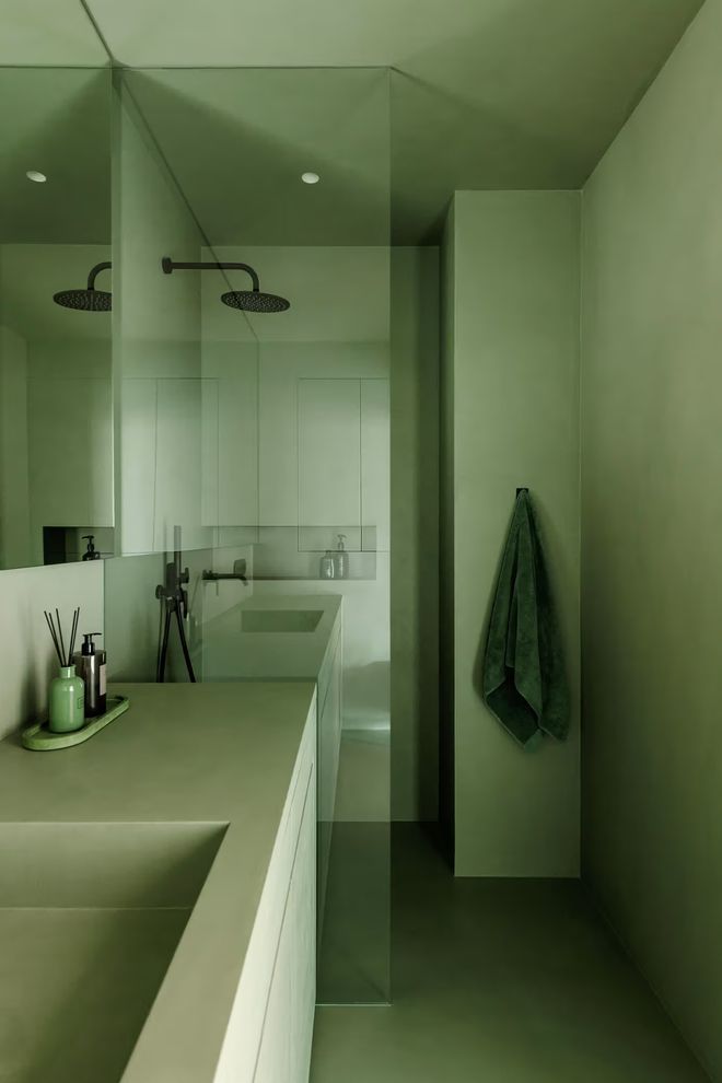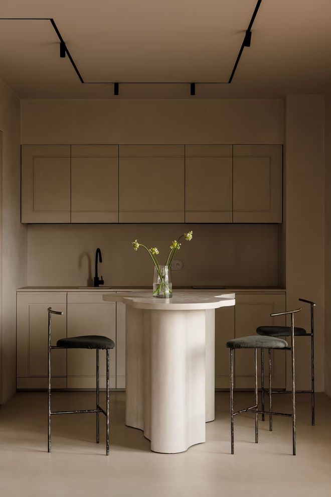 浴室以高贵的绿色打破米色基调,微水泥包裹全境,大镜面延展视野。厨房则以连续的石膏饰面与弧形吧台,将功能与材质叙事融为一体。
