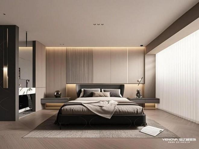 卧室作为卸下疲惫的私属秘境,处处透着舒适与松弛。人字拼木地板的温暖肌理,与床头线性灯光相互呼应,搭配简约却精致的艺术摆件,剔除多余装饰,将舒适与质感做到极致,让睡眠成为一场沉浸式的疗愈之旅。