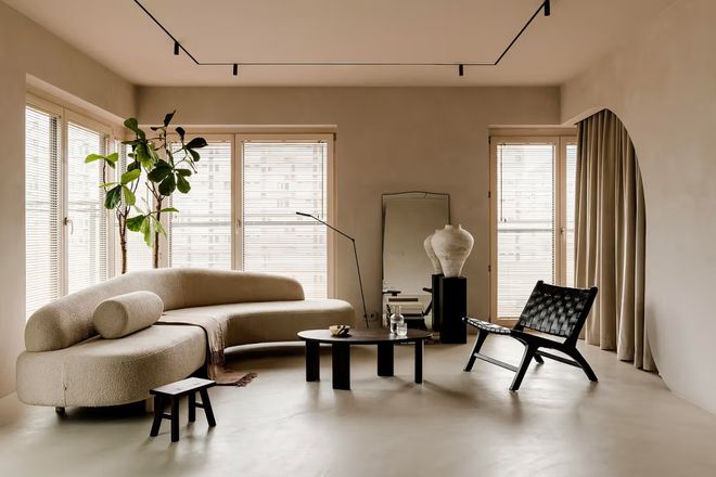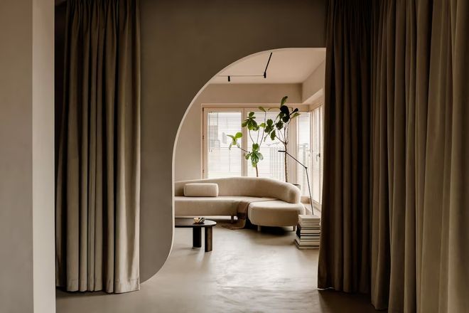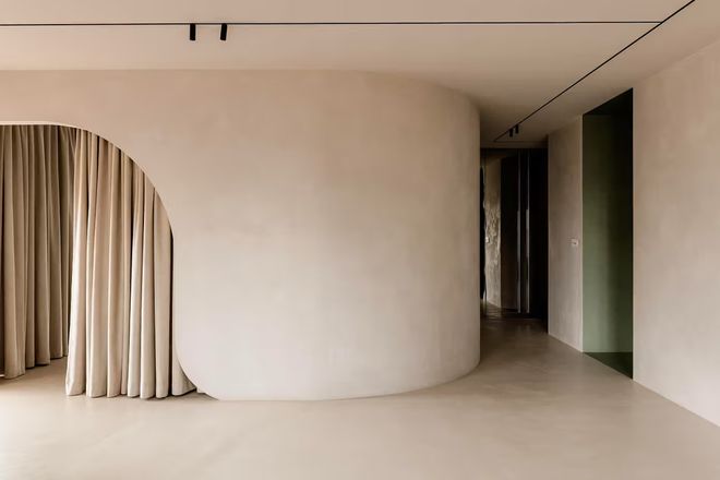 一面弧形墙在起居室与卧室之间划出柔和界限,椭圆形开口成为空间中的标志性元素。它不仅组织了日常动线,也为空间带来节奏与仪式感。