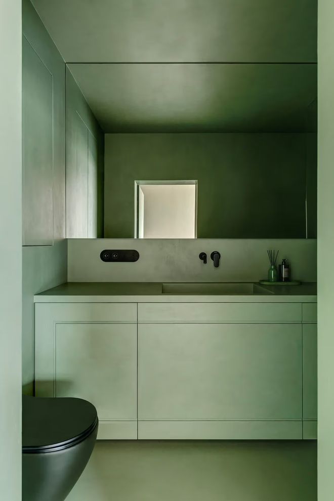浴室以高贵的绿色打破米色基调,微水泥包裹全境,大镜面延展视野。厨房则以连续的石膏饰面与弧形吧台,将功能与材质叙事融为一体。